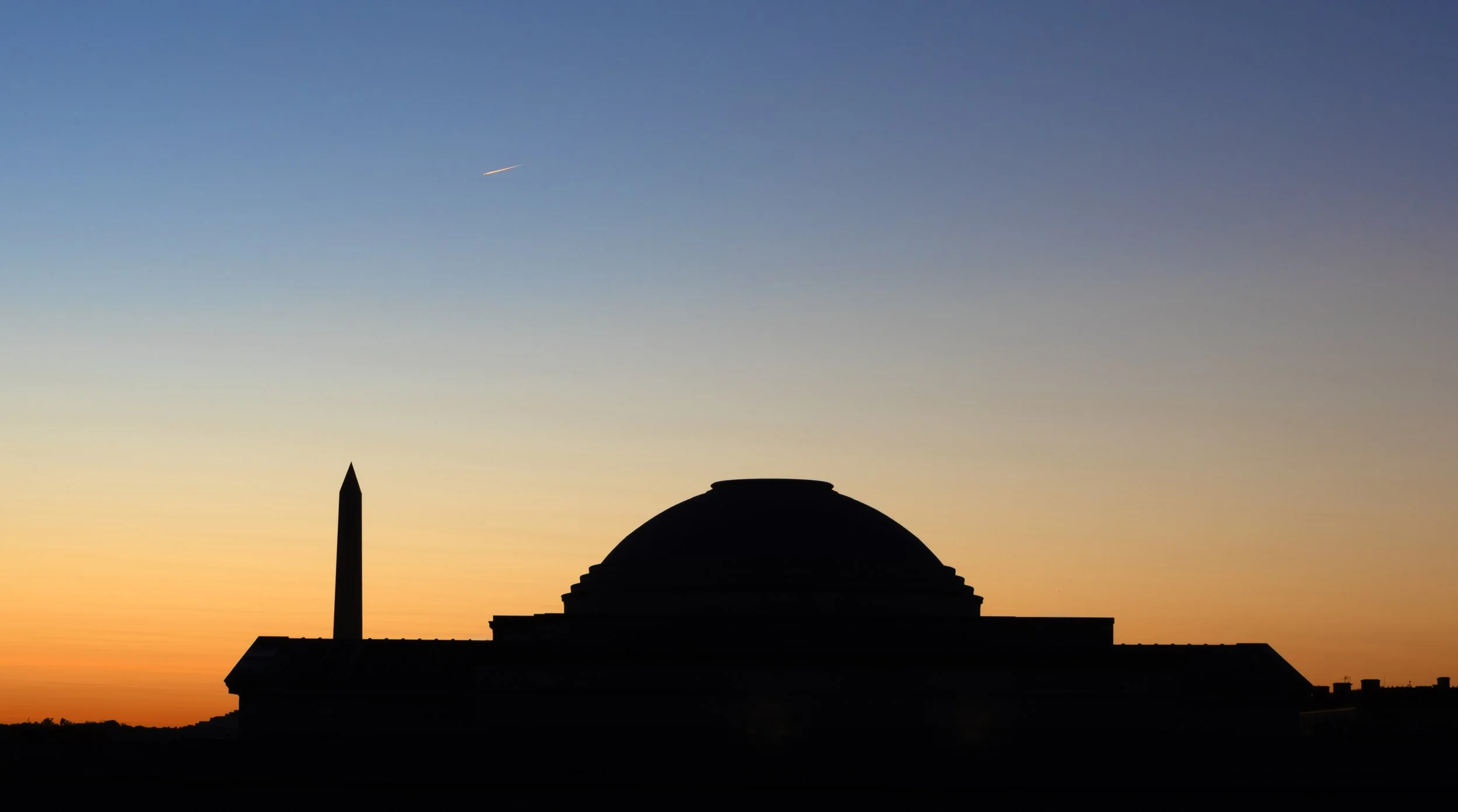 National Gallery of Art at sunset with Atlas Comet passing by 2025.